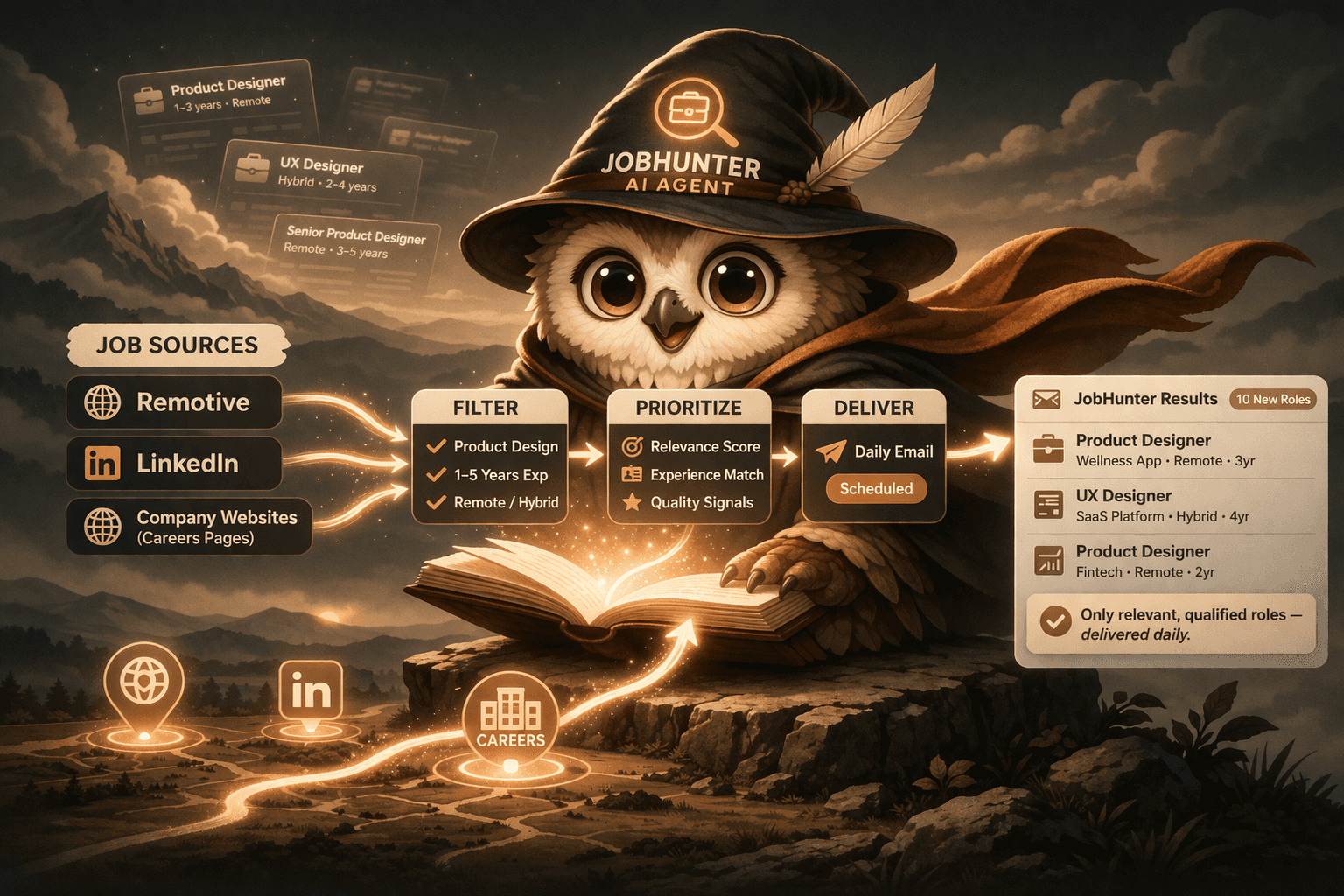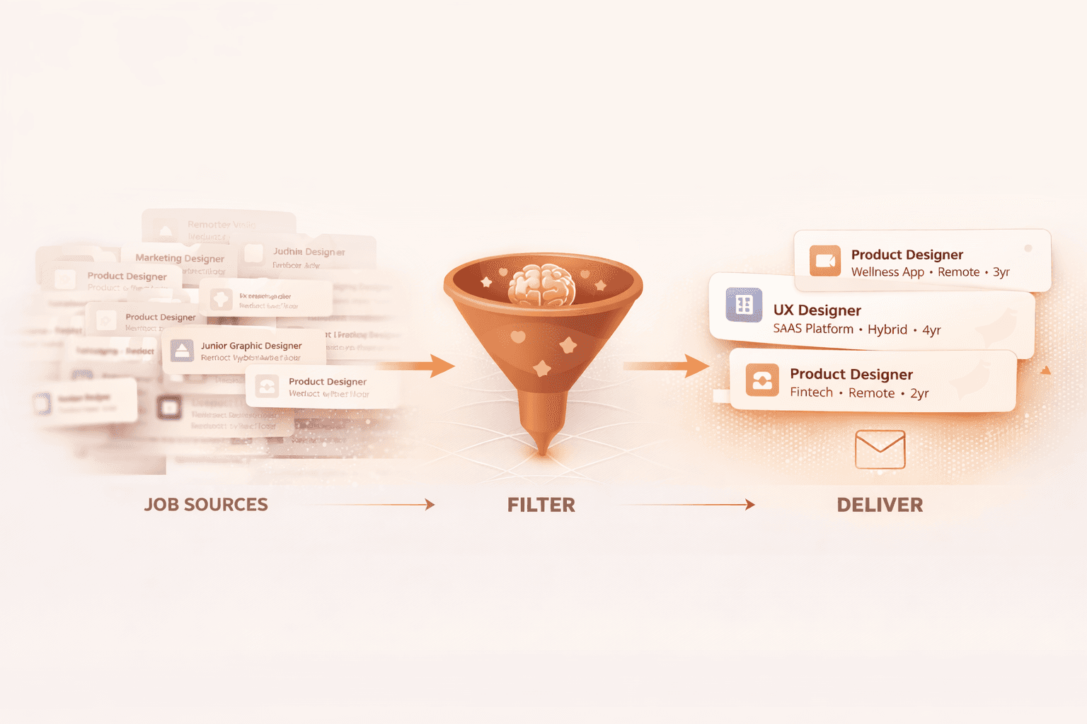 An AI-powered agent that runs on a schedule, scans multiple job sources, filters for relevance, and delivers only qualified product design roles directly to me.